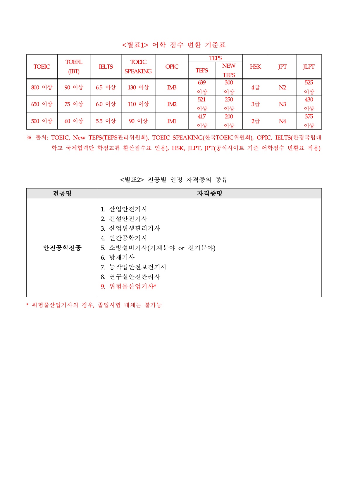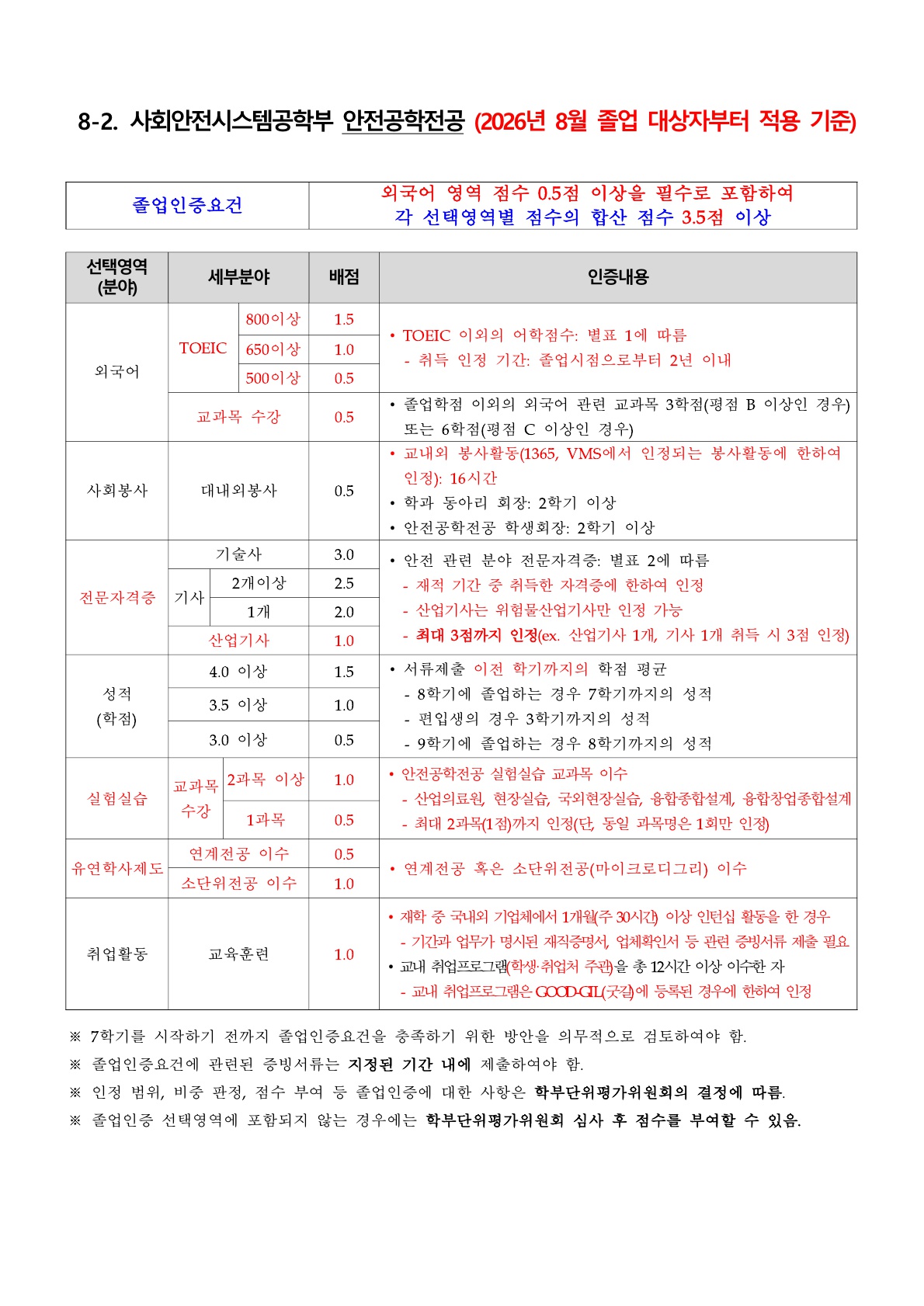 안전공학전공 졸업인증 요건 신규 변경(안) (2026년 8월 졸업예정자부터 적용)