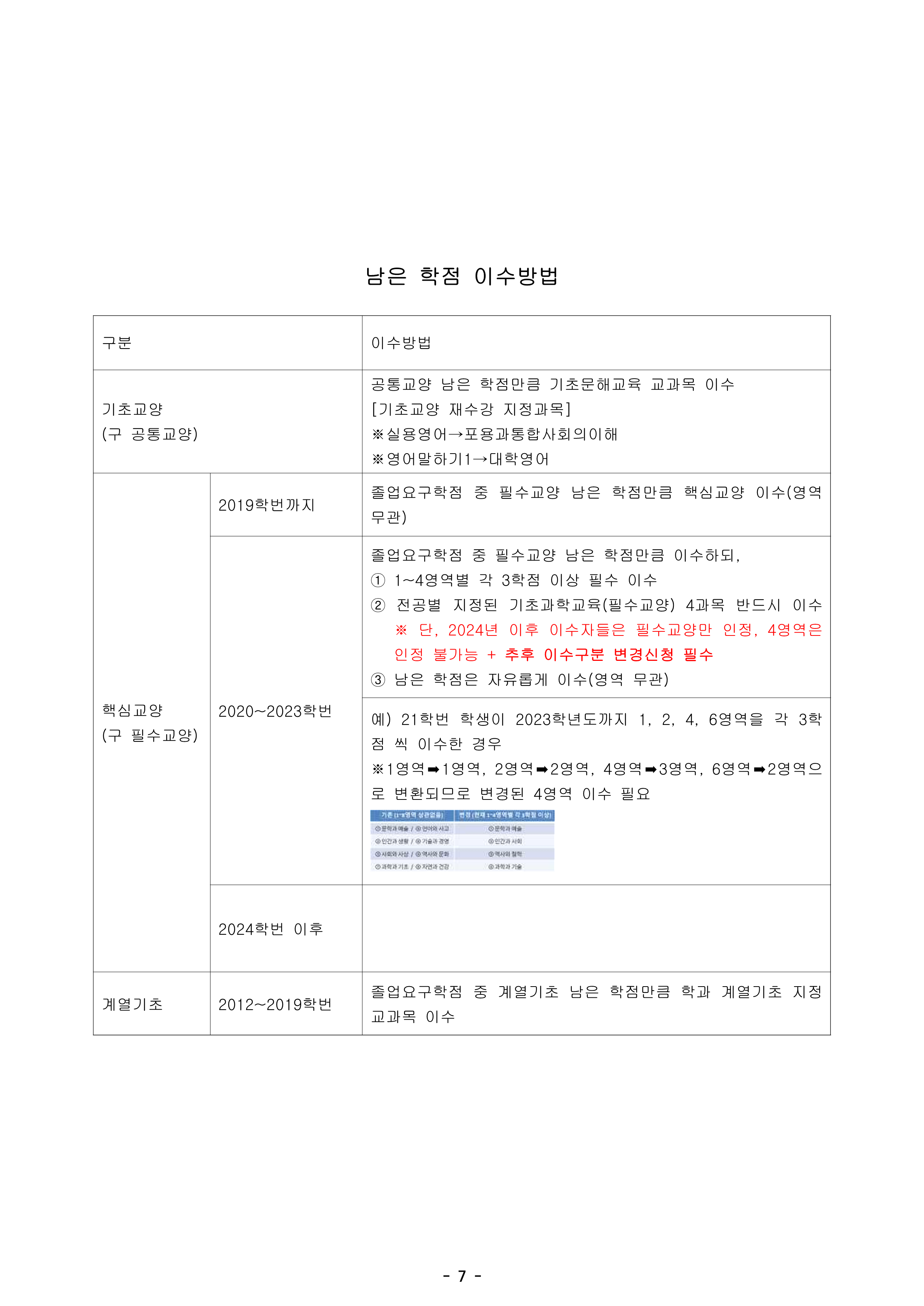 매년 교양 교육과정이 개편되고 있어서, 몇 학번이 몇 년도에 이수하였는지에 따라 조금씩 인정되는 범위가 달라지므로 유의하여 수강해주시기 바랍니다.