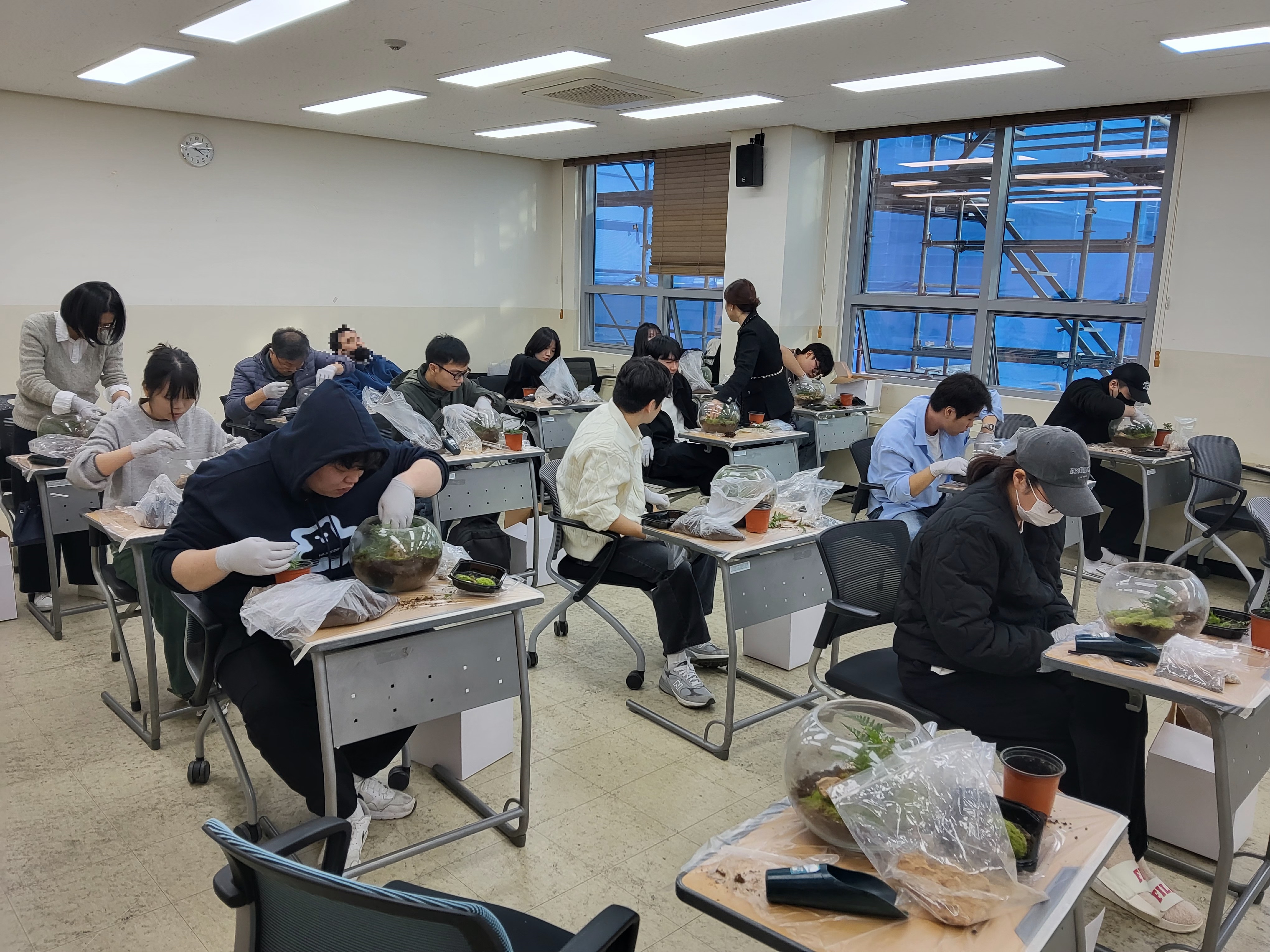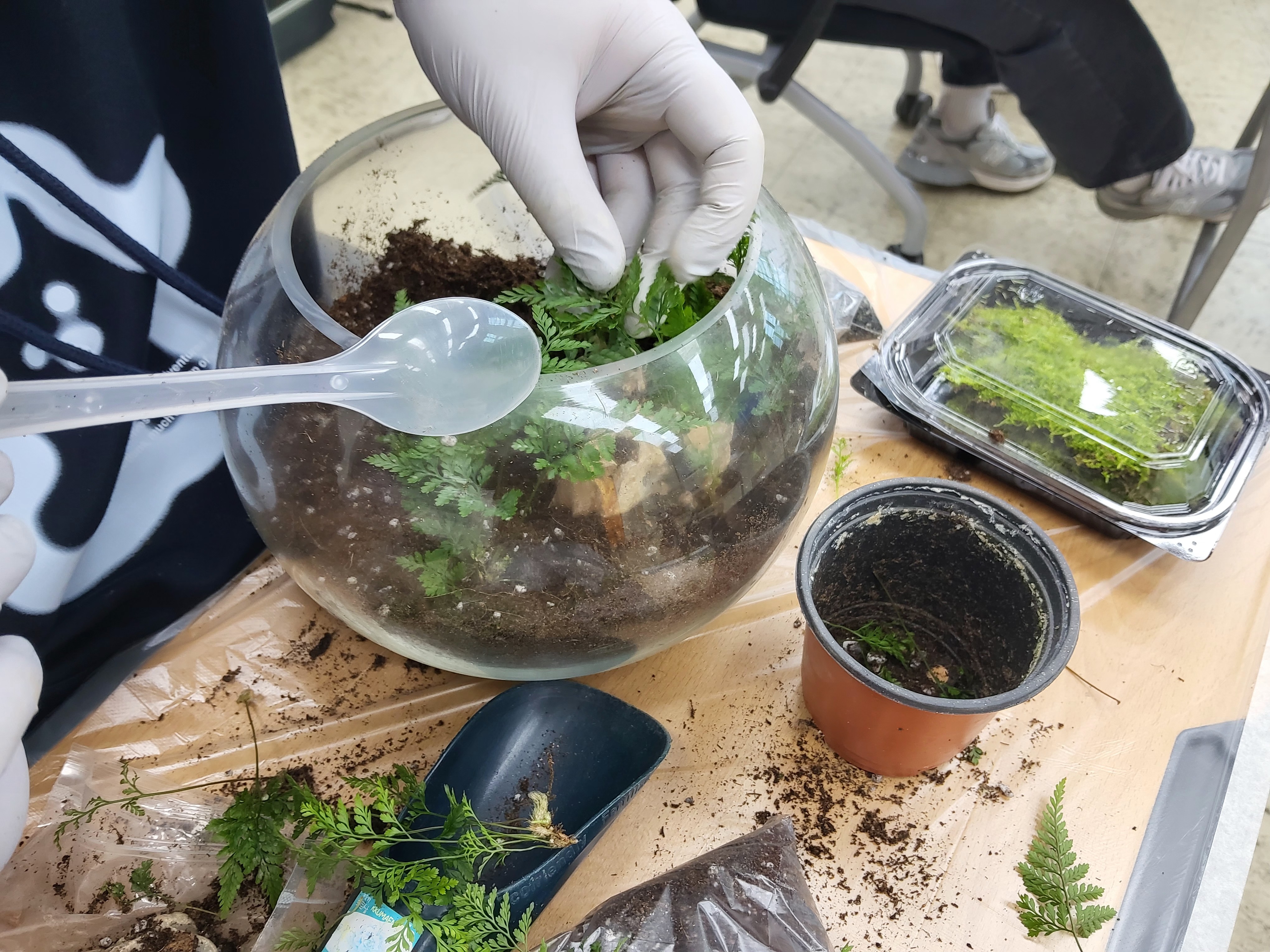 학생들은 각자 투명한 유리병에 자갈, 흙, 이끼를 차곡차곡 쌓으며 자신만의 미니 정원을 만들기 시작했습니다.