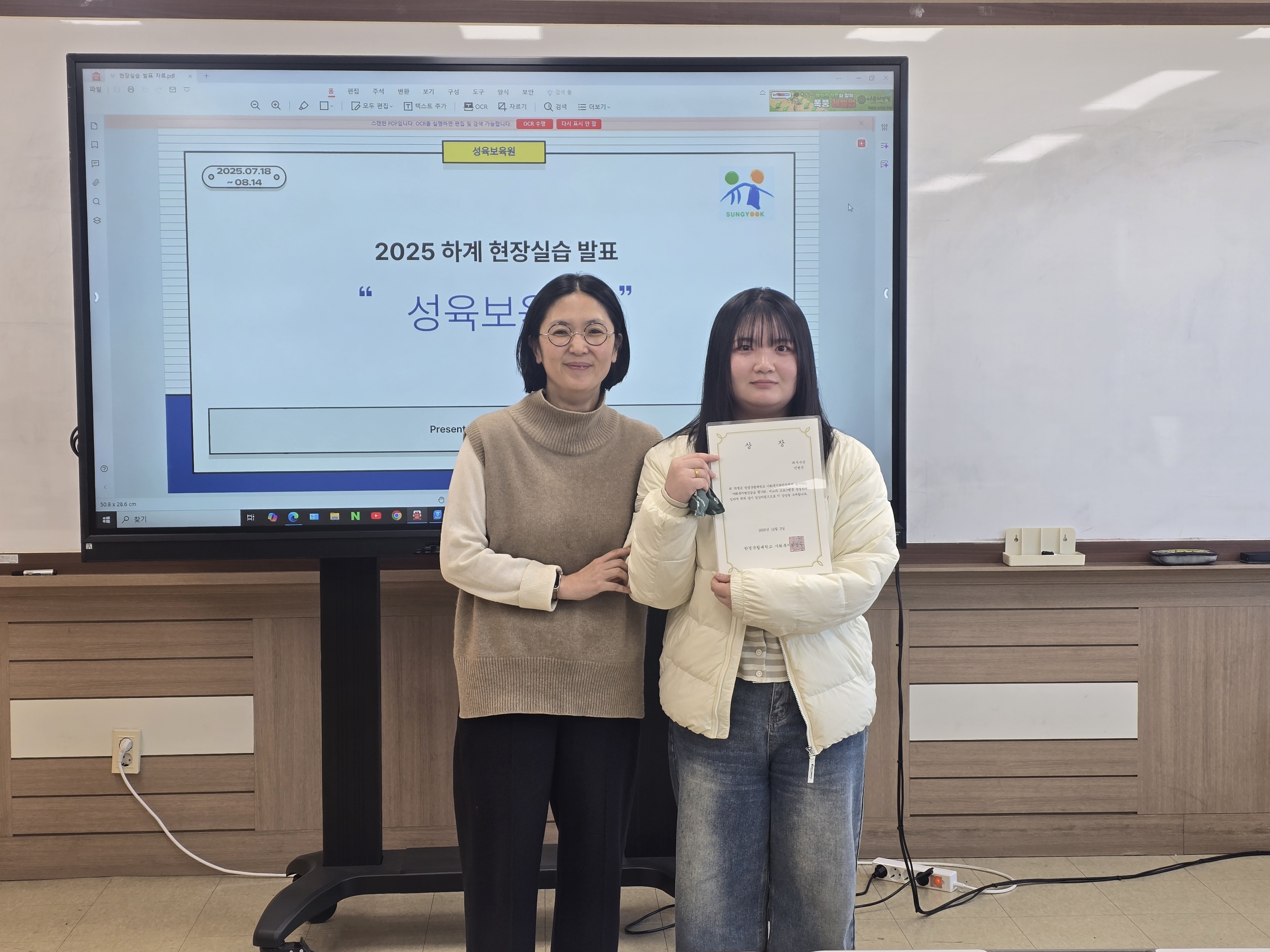 안녕하세요. 저희 사회복지학과에서 사회복지 현장실습 평가회를 진행했습니다. 우수한 학생들에게는 장학금도 지급하였습니다.