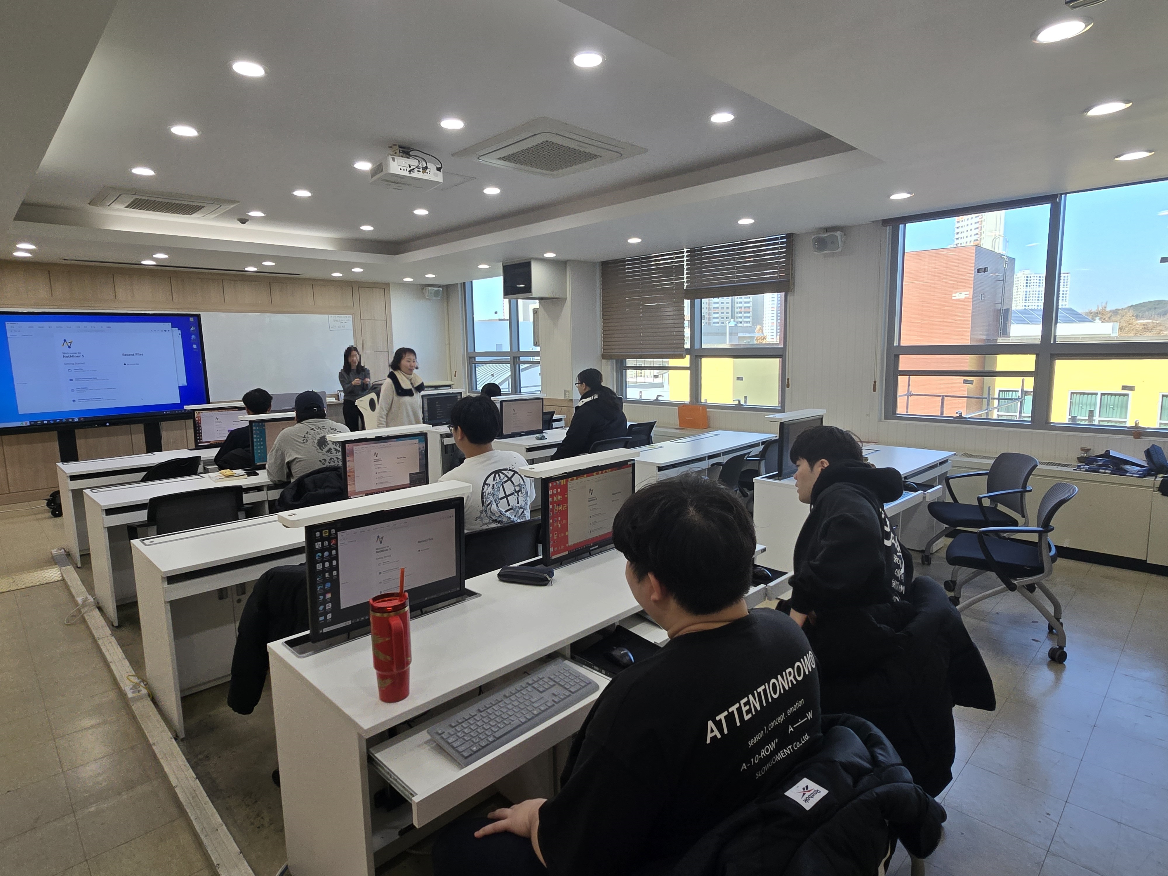 이후에는 넷마이너 프로그램을 활용한 실습이 이어졌습니다. 학생들은 직접 프로그램을 조작해 데이터를 불러오고 시각화하는 과정을 경험했습니다. 특히 특정 검색어를 설정해 주제와 관련된 영상 데이터를 수집하고, 영상 수와 채널 분포 등을 확인해보는 실습이 진행되었습니다. 또한 해당 영상에 달린 댓글 속 키워드를 추출하여 키워드 간 연결 구조를 시각적으로 살펴보며 주요 담론과 의견 흐름을 파악하는 분석도 시도했습니다. 이 과정을 통해 학생들은 데이터 수집부터 시각화, 해석까지 소셜 네트워크 분석의 실제 절차를 체계적으로 이해할 수 있었습니다.