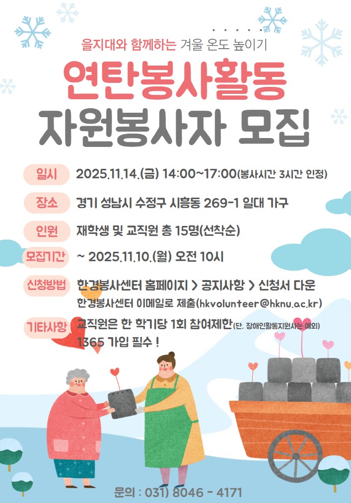fnctId=bbs,fnctNo=374 단축 url 글번호 89794 2025년 을지대와 함께하는 연탄 나누기 봉사활동 참여 안내 작성일 2025.10.30 수정일 2025.10.30 작성자 최다솔 조회수 1013 첨부파일 (붙임1) 자원봉사활동 참가신청서_교직원(서식).hwp (붙임2) 자원봉사활동 참가신청서_학생용(서식).hwp