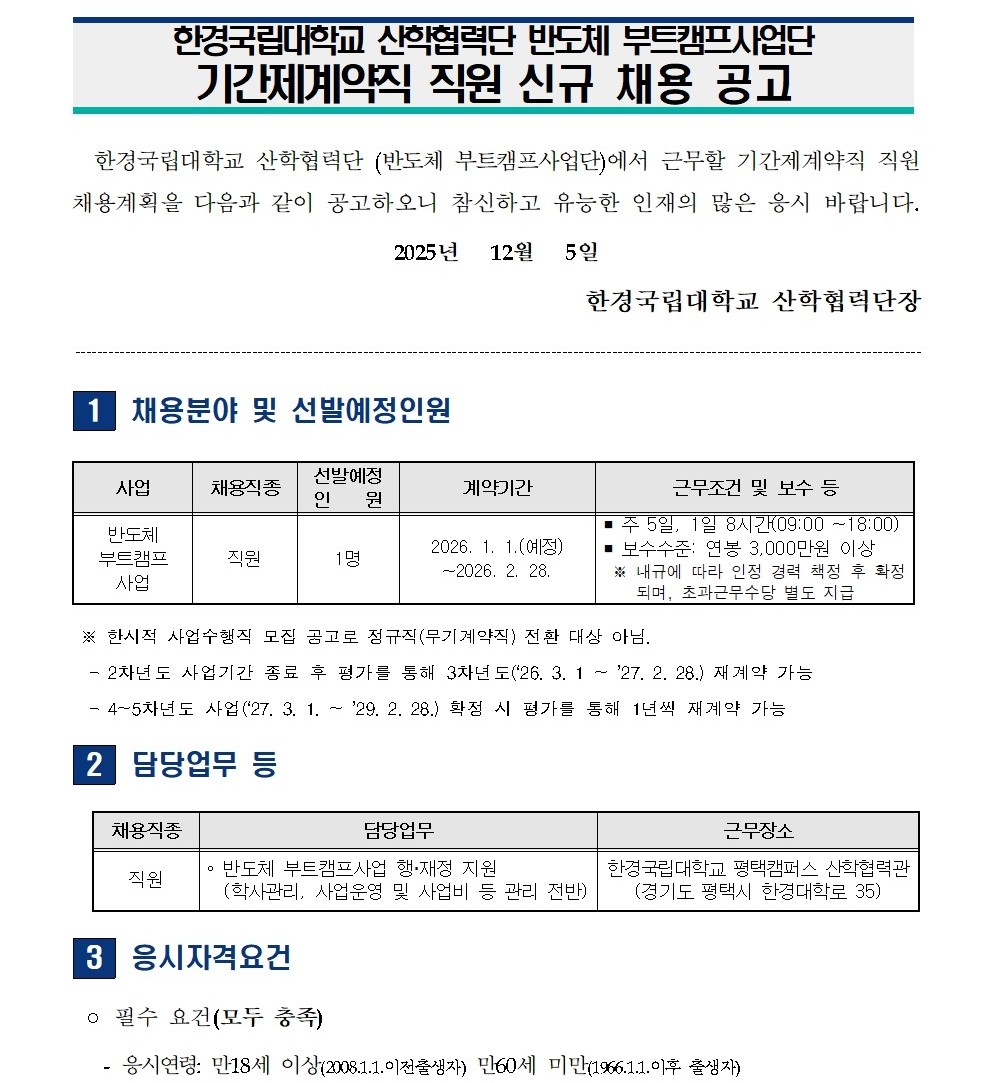 fnctId=bbs,fnctNo=350 단축 url 글번호 90896 [채용공고] 한경국립대학교 산학협력단 반도체 부트캠프사업단 계약직원 신규 채용 작성일 2025.12.05 수정일 2025.12.05 작성자 산학협력단 조회수 874 첨부파일 반도체 부트캠프사업단 기간제계약직 직원 신규 채용 공고문.hwp